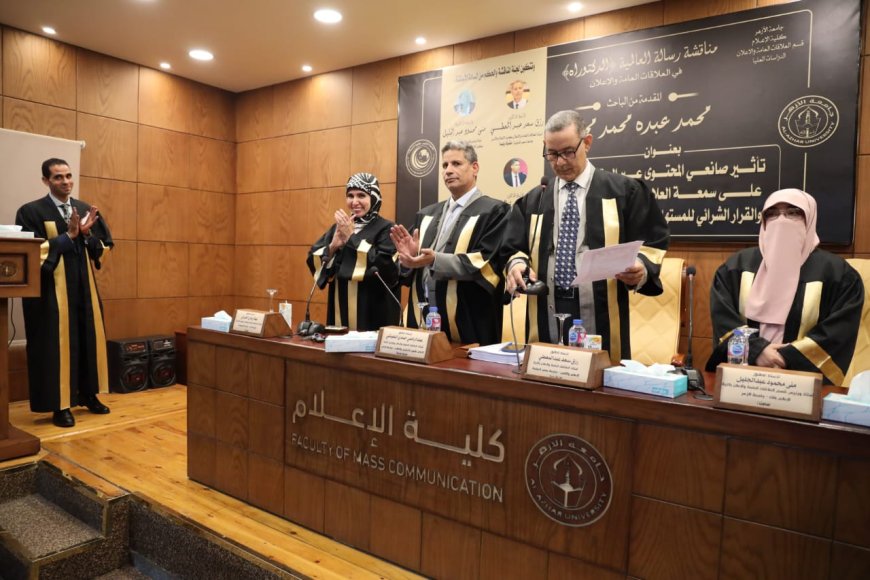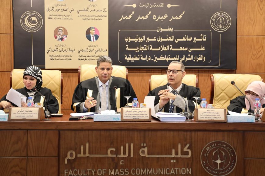 نوقشت بكلية الإعلام في جامعة الأزهر رسالة الدكتوراه المقدمة من الباحث محمد عبده محمد بقسم العلاقات العامة والإعلان، وذلك بعنوان: "تأثير صانعي المحتوى عبر اليوتيوب على سمعة العلامة التجارية والقرار الشرائي للمستهلكين – دراسة تطبيقية".