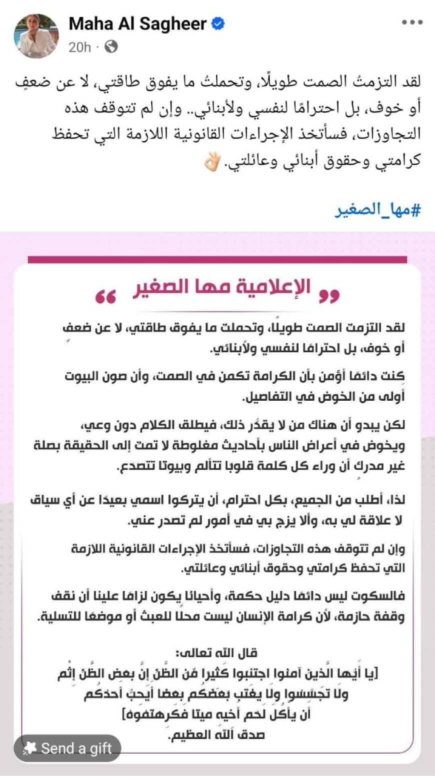 حيث أصدرت مها الصغير بيانًا، عبر حسابها الشخصي بموقع التواصل الاجتماعي الفيسبوك، أكدت خلاله أن التزامها الصمت خلال الفترة الماضية لم يكن عن ضعف، وإنما احترامًا لنفسها وأبنائه.